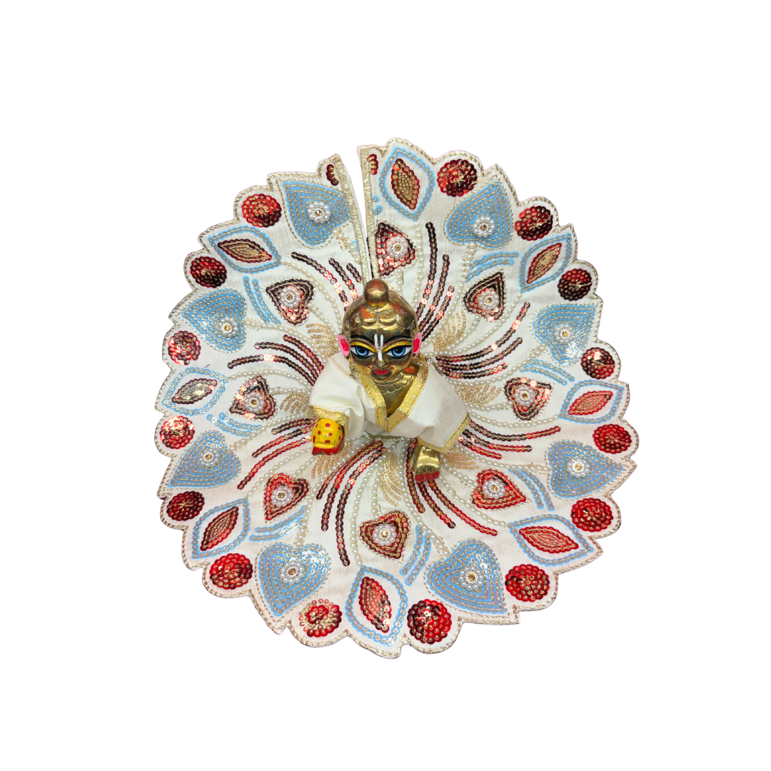 The Peacock Petals Embroidered White Dress is available in various sizes to suit different Laddu Gopal idols, ensuring a perfect fit. Each piece is carefully stitched and finished with delicate embellishments to reflect the love and care you have for your deity.