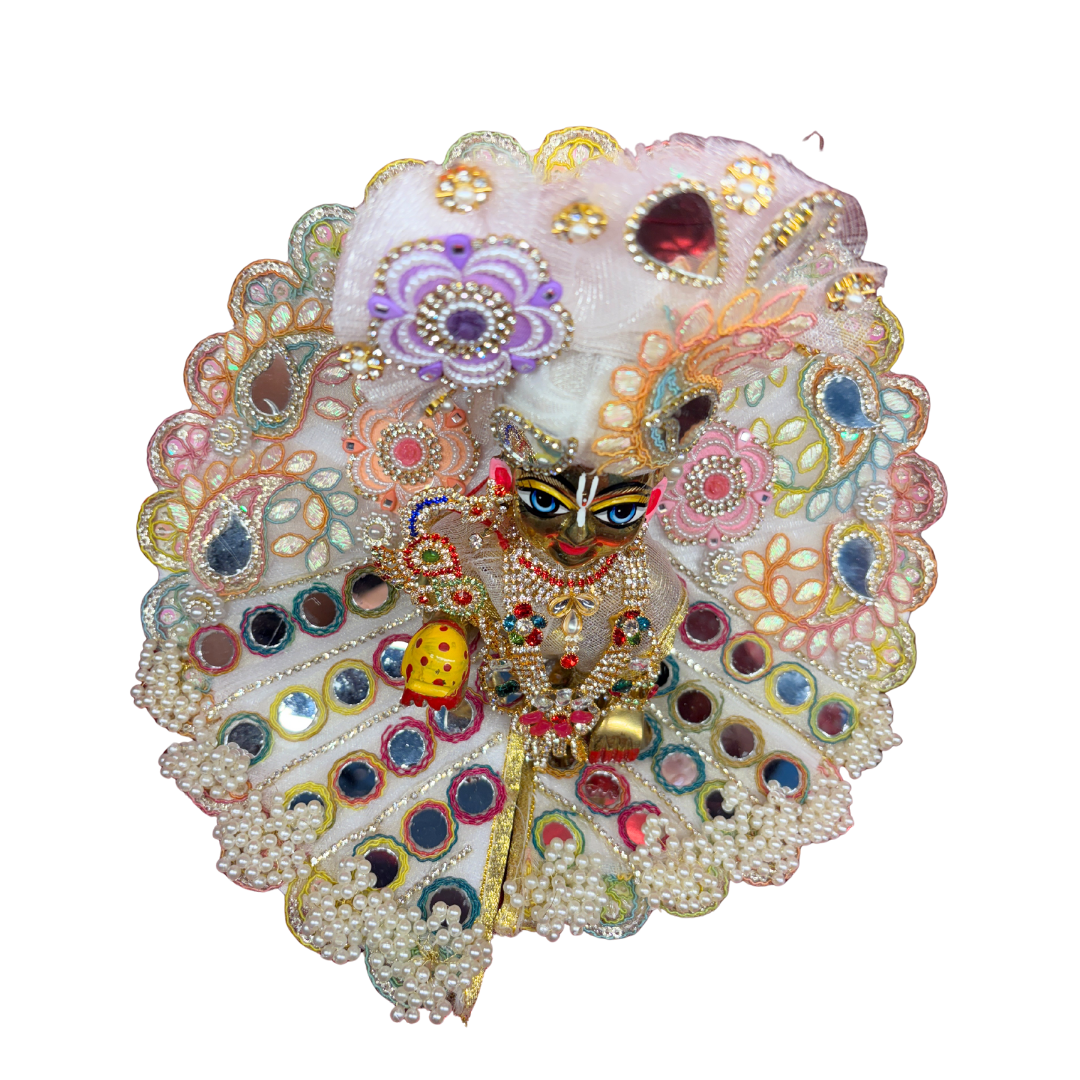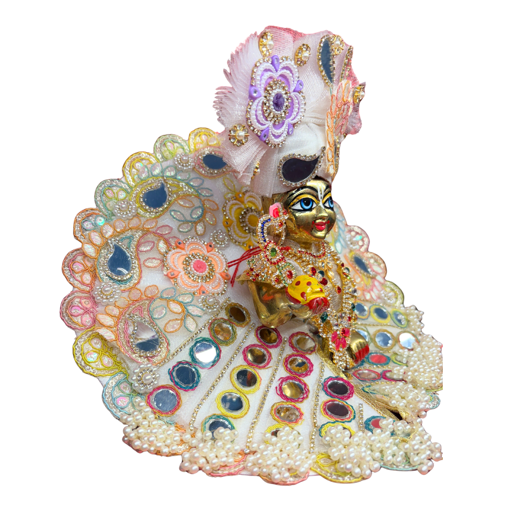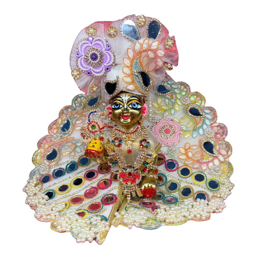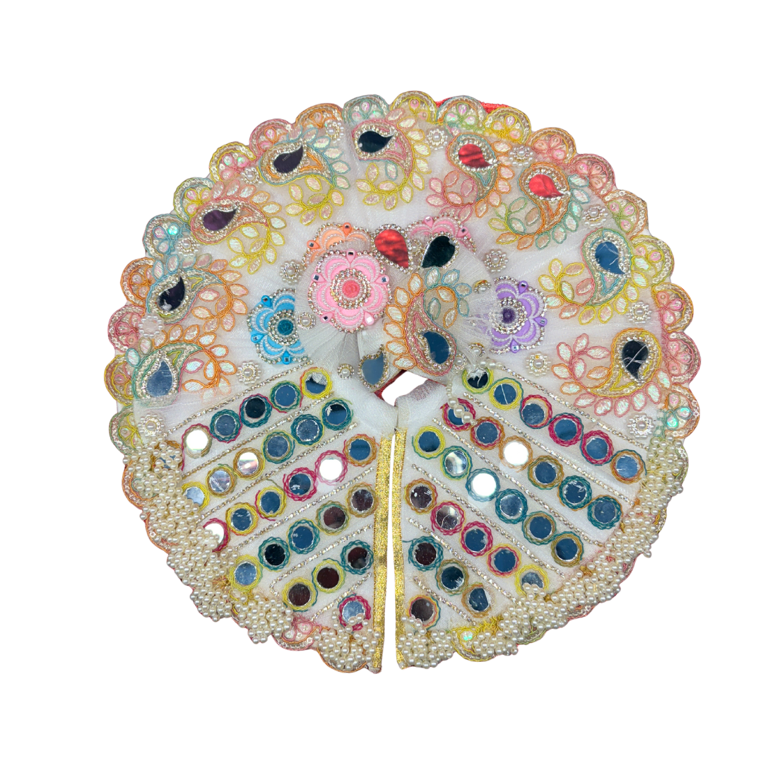 Add a royal touch to your Laddu Gopal ji’s shringar with the Rajsi Kanha Embroidered Mirror Dress. This exquisite round poshak is designed with delicate thread embroidery, multicolored mirror embellishments, and pastel-toned fabric accents, creating a vibrant yet serene aesthetic. The soft beige base is thoughtfully decorated with peacock feather-style patterns, giving it a majestic and spiritual appeal.